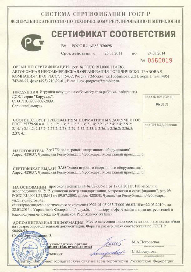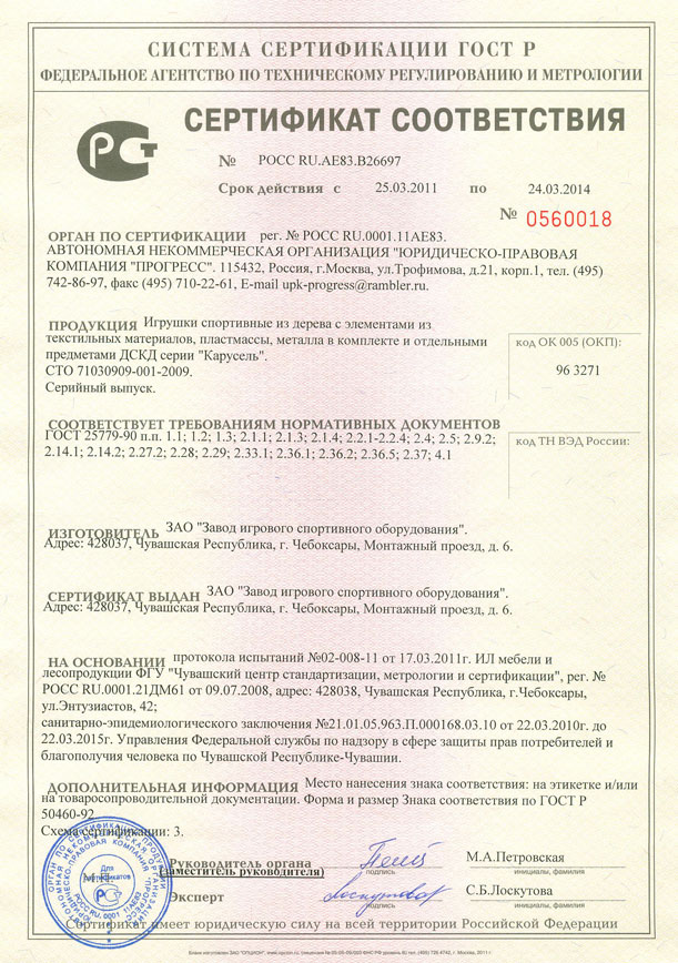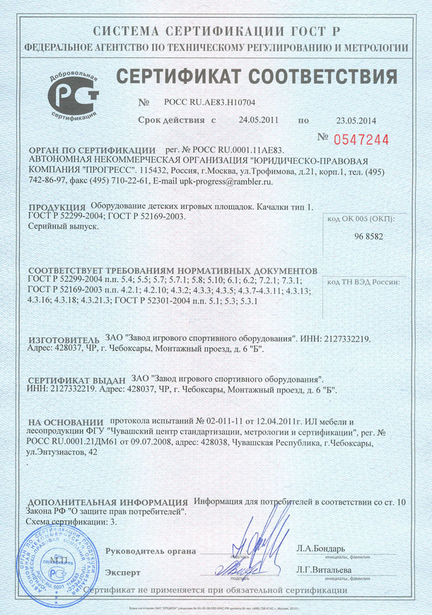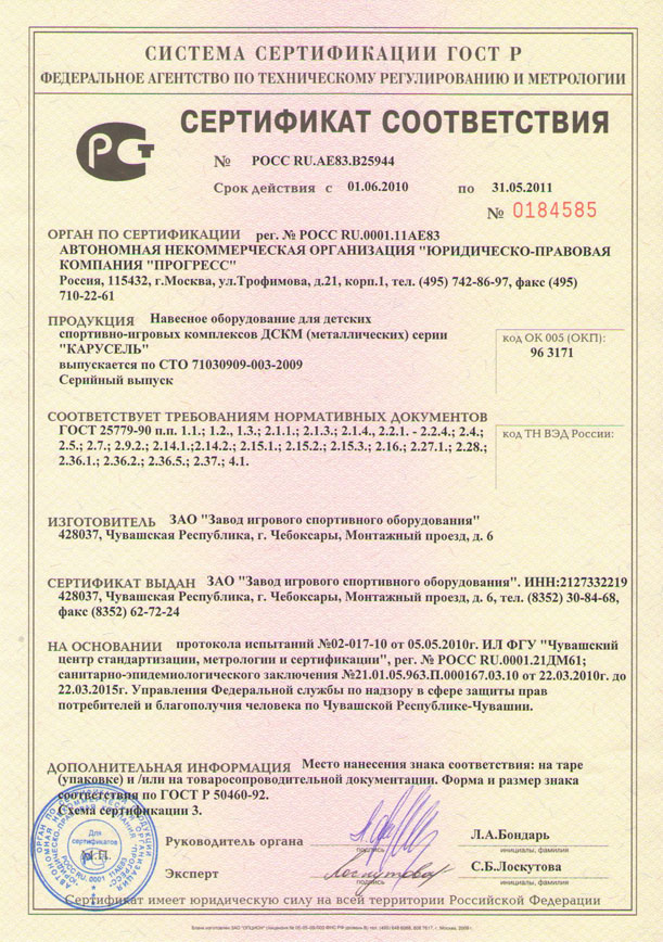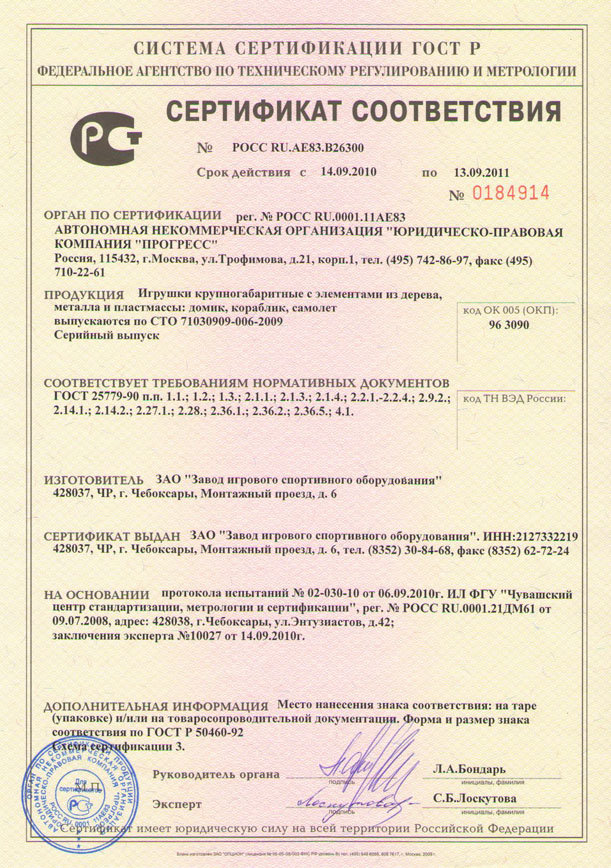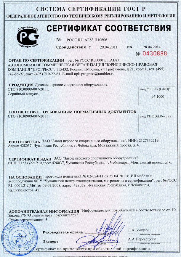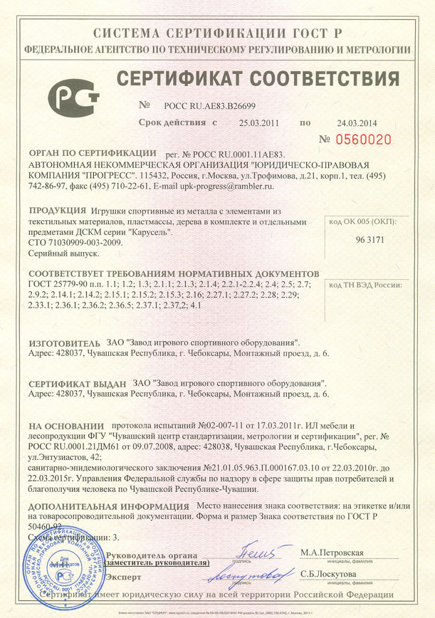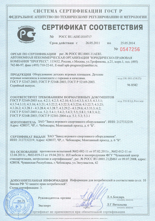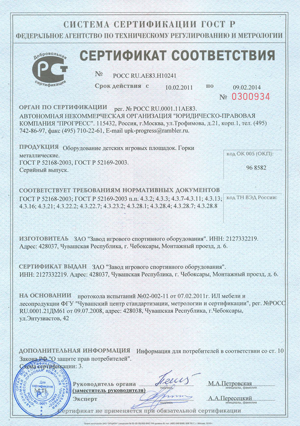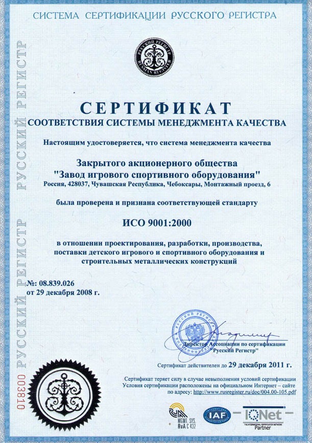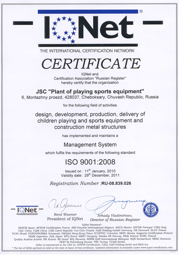 Проектирование, разработка, производство и поставка детского игрового и спортивного оборудования и строительных металлических конструкций соответствуют стандарту ISO 9001:2000 |